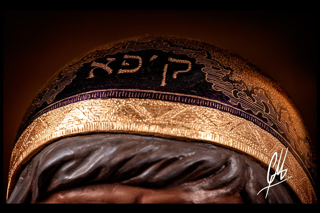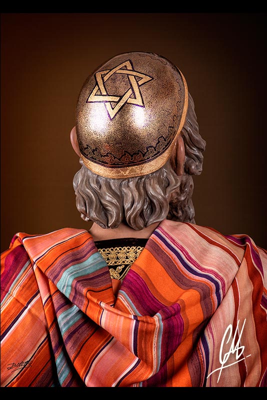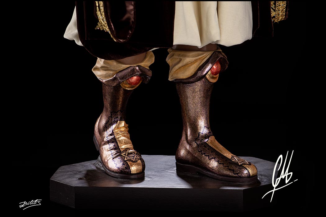 Tanto el tocado como las botas ha sido estofados al temple al huevo realizando una ornamentación con motivos judíos y rocallas. En el frente del tocado se ha colocado el nombre Caifás en arameo. Por último han sido cincelados a mano las decoraciones.