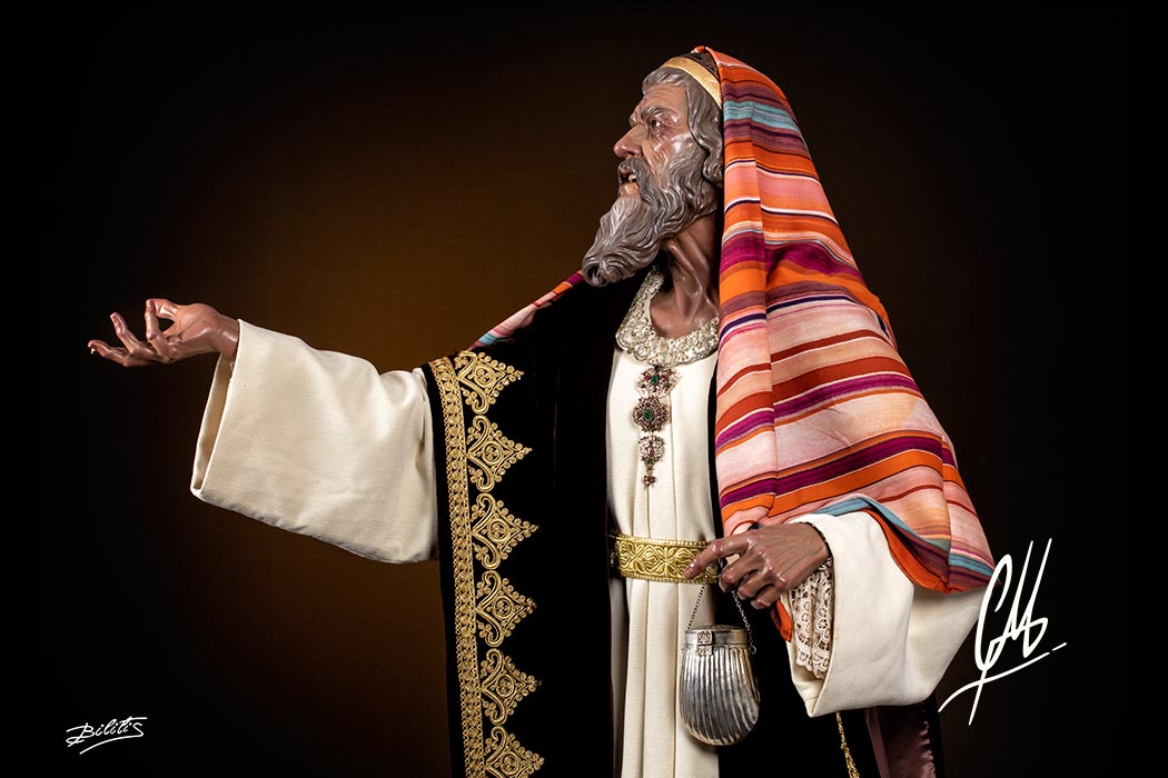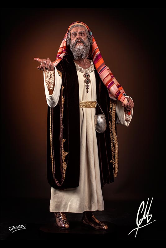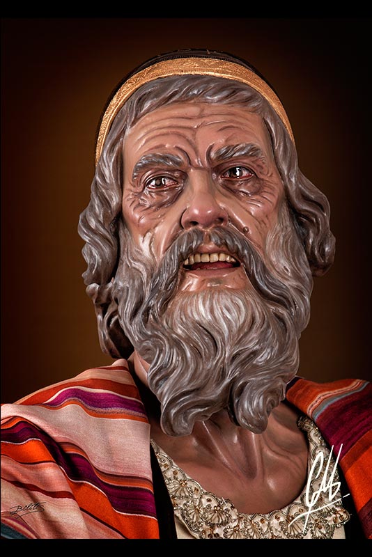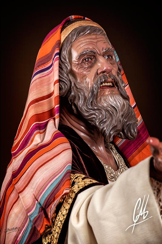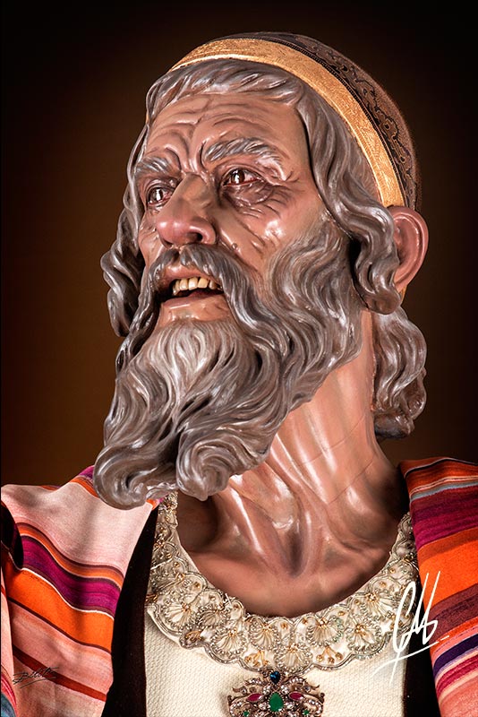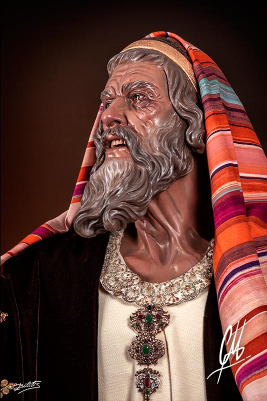 La cabeza, de mucha fuerza expresiva, se gira hacia su derecha alzando la mirada hacia Poncio Pilatos al que increpa con la mano derecha en alto y la mano izquierda señalando a la Cruz. Para la realización del anciano pontífice se ha utilizado como modelo al padre del autor, exagerando lo necesario para que funcione como imagen procesional. Se ha querido hacer un estudio exhaustivo de la anatomía de cuello que refuerza la expresión del giro de cabeza. Como notas anecdóticas se han incluido sobre la piel puntos con volumen como lunares y otros, propios del modelo y exagerados. También se ha querido representar el ojo derecho con un principio de cataratas, propia de la edad. La boca ha sido terminada por dentro con lengua de talla y dientes de protésico dental. Las manos también han sido realizadas teniendo en cuenta la edad de la imagen a representar, haciendo una anatomía que se engrosa en los nudillos por causa de una incipiente artrosis, y que estudia la piel, huesos y músculos. Las piernas han sido talladas en directo acabándolas a todo detalle hasta la mitad del muslo. Para el calzado de la imagen se han tallado unas botas al estilo de imágenes barrocas y teniendo en cuenta la posición social de sumo sacerdote del Sanedrín.